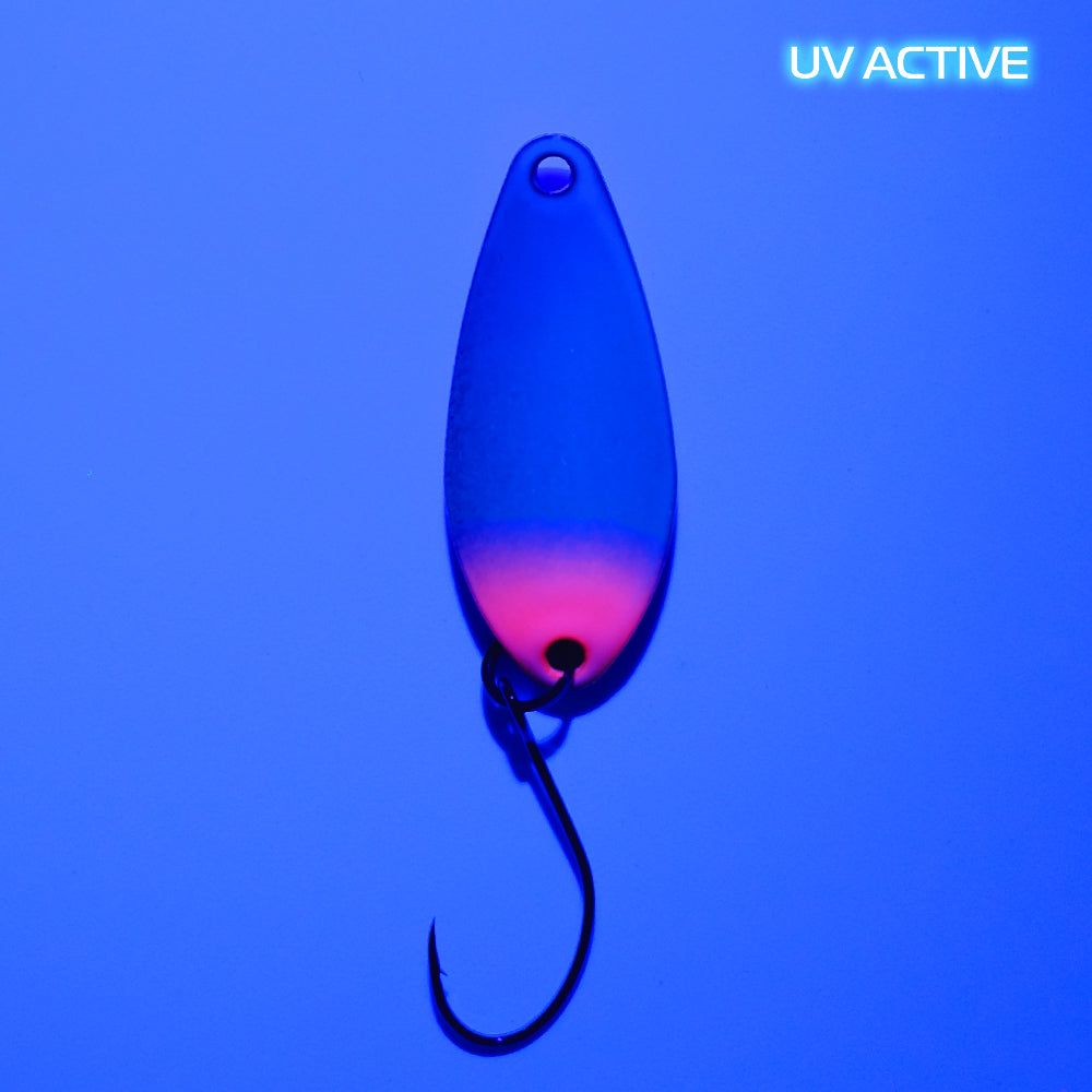 CHEAT 2 g is a brand new spoon from FANGENSWERT. As the name of this extremely interesting spoon suggests, CHEAT is often a universal key on the water that can open practically all doors in the trout world. Because this spoon can really do everything. With its weight of 2 g and its well thought-out shape, CHEAT can be cast really far and can be used in almost any water depth if necessary, even though it is primarily designed for mid-water. As a fairly wide-surface spoon, CHEAT unfolds its beautiful game right from the first turn of the crank .