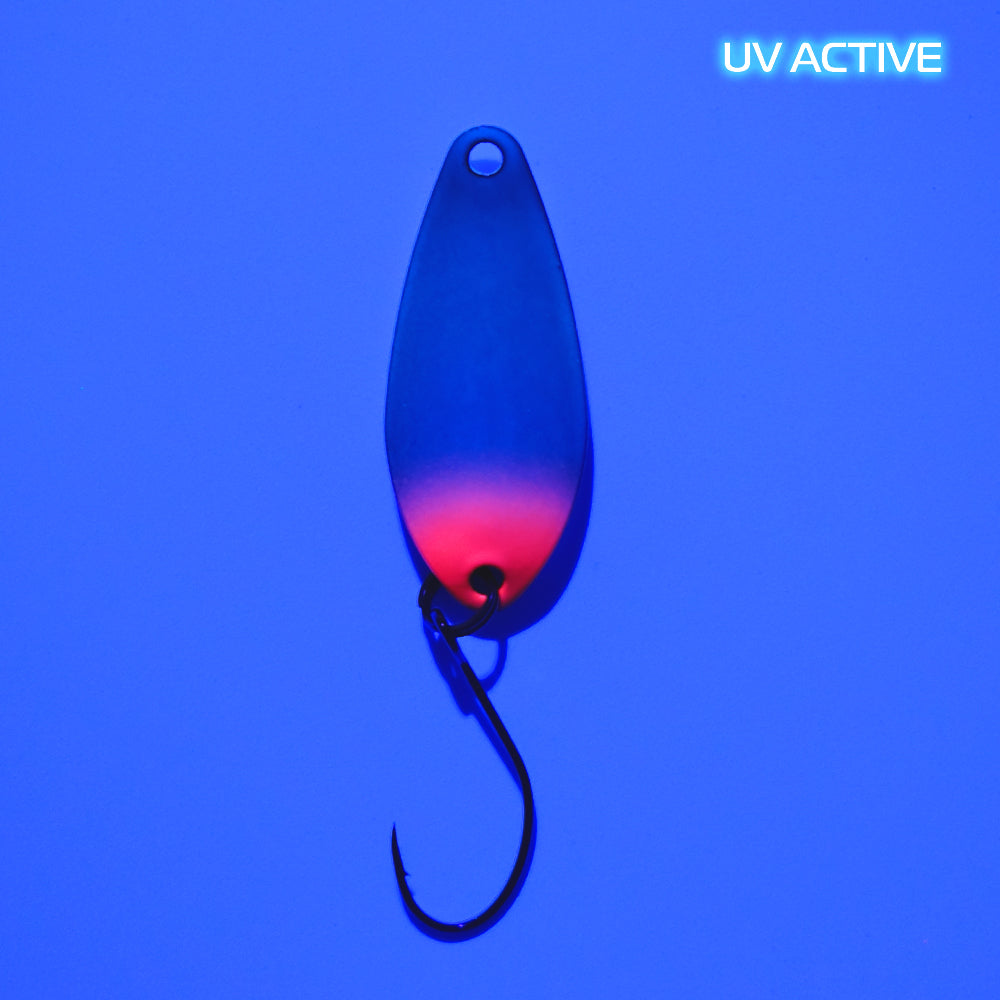 CHEAT 2 g is a brand new spoon from FANGENSWERT. As the name of this extremely interesting spoon suggests, CHEAT is often a universal key on the water that can open practically all doors in the trout world. Because this spoon can really do everything. With its weight of 2 g and its well thought-out shape, CHEAT can be cast really far and can be used in almost any water depth if necessary, even though it is primarily designed for mid-water. As a fairly wide-surface spoon, CHEAT unfolds its beautiful game right from the first turn of the crank .