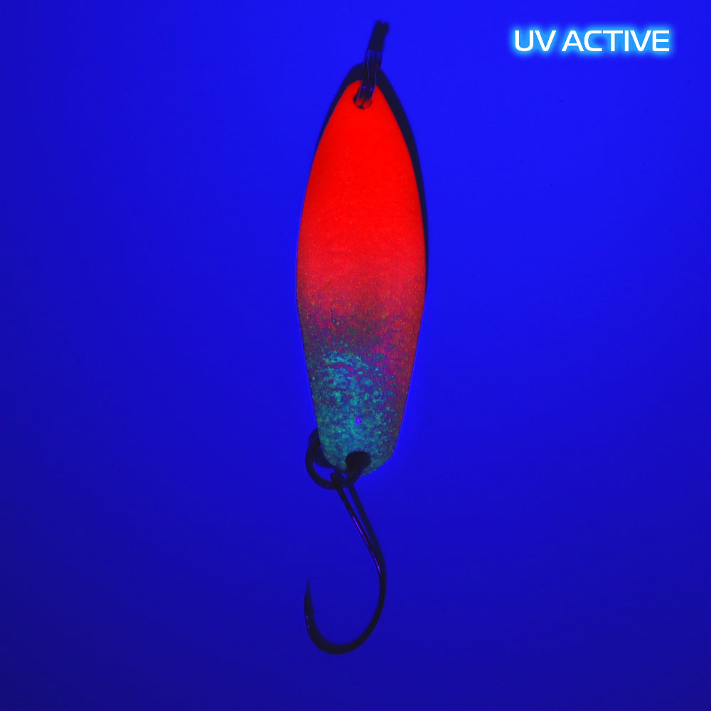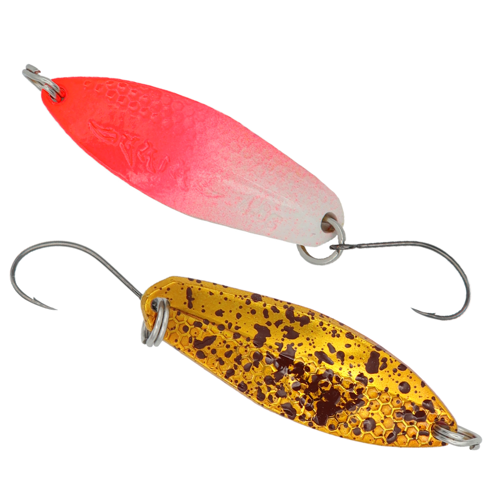 GAiA from 4.8 g to 7.7 g from GOD HANDS is a spoon that can inspire everyone with its shape. Long and wide at the same time, with a central "break" that gradually ends with a Y-shaped bend. One half of the spoon has several hexagonal cuts that create a unique shimmering effect when guided. In combination with its very frequent movement, GAiA leaves even the most fussy trout unmoved.