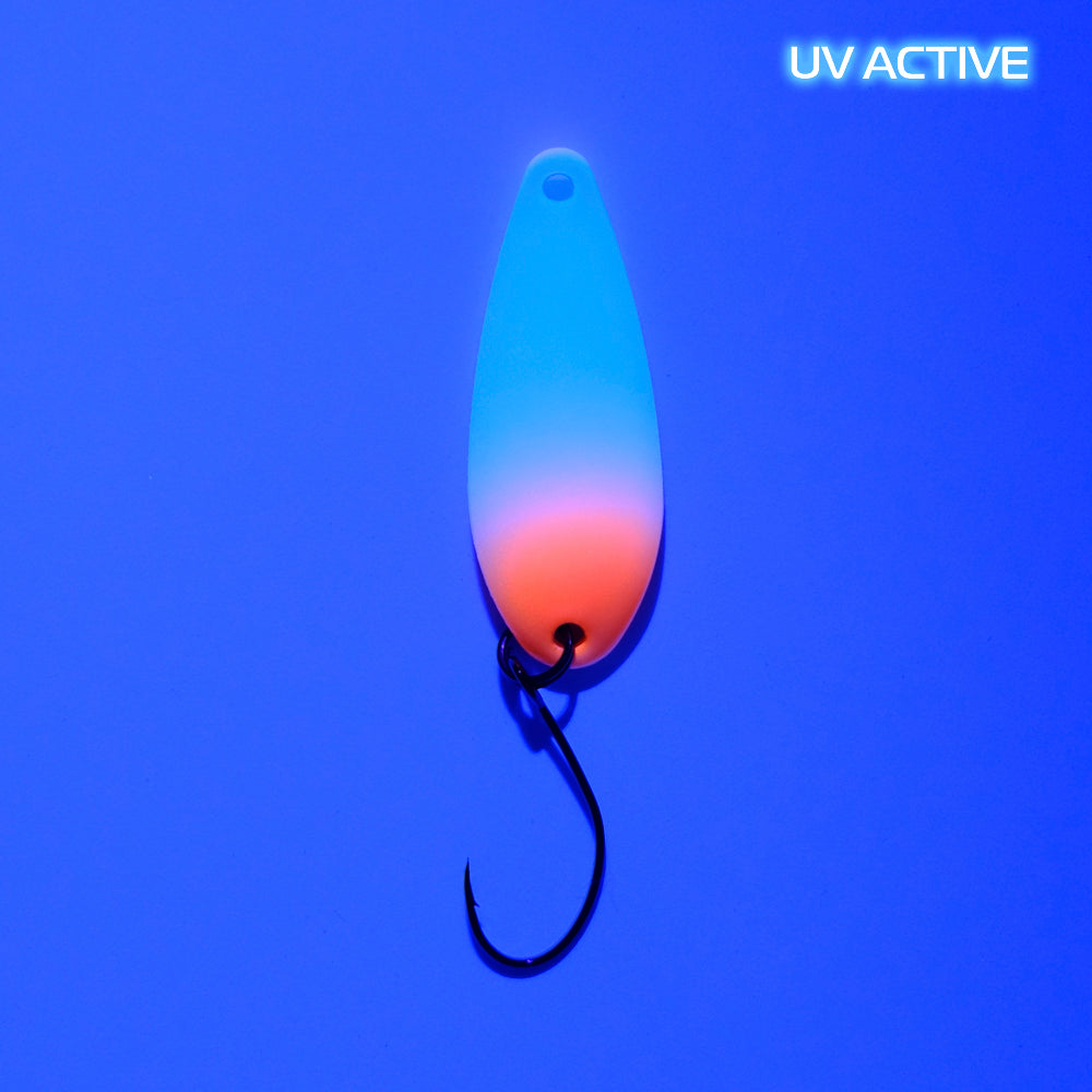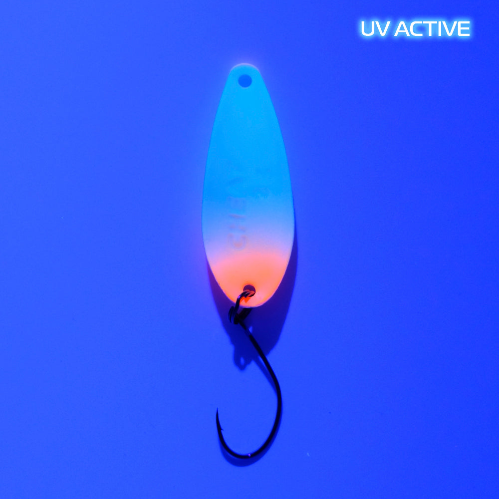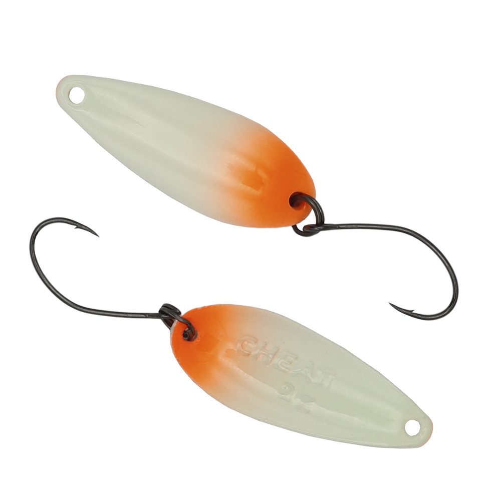 CHEAT 2 g ist ein brandneuer Spoon von FANGENSWERT. Wie der Name dieses äußerst interessanten Spoons schon verrät, wird CHEAT am Wasser sehr oft zu einem universellen Schlüssel, der praktisch alle Türen der Forellenwelt öffnen kann. Denn dieser Spoon kann wirklich alles. Mit seinem Gewicht von 2 g und seiner durchdachten Form lässt sich CHEAT richtig weit auswerfen und kann bei Bedarf in nahezu allen Wassertiefen geführt werden, auch wenn er in erster Linie fürs Mittelwasser konzipiert ist. Als ein ziemlich breitflächiger Spoon entfaltet CHEAT sein schönes Spiel direkt mit der ersten Kurbelumdrehung.