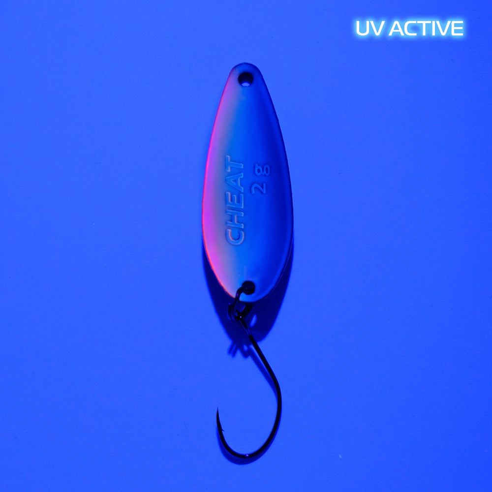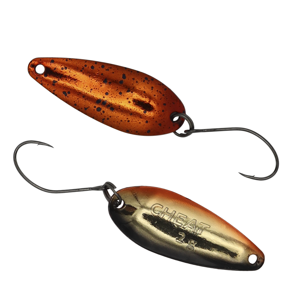 CHEAT 2 g ist ein brandneuer Spoon von FANGENSWERT. Wie der Name dieses äußerst interessanten Spoons schon verrät, wird CHEAT am Wasser sehr oft zu einem universellen Schlüssel, der praktisch alle Türen der Forellenwelt öffnen kann. Denn dieser Spoon kann wirklich alles. Mit seinem Gewicht von 2 g und seiner durchdachten Form lässt sich CHEAT richtig weit auswerfen und kann bei Bedarf in nahezu allen Wassertiefen geführt werden, auch wenn er in erster Linie fürs Mittelwasser konzipiert ist. Als ein ziemlich breitflächiger Spoon entfaltet CHEAT sein schönes Spiel direkt mit der ersten Kurbelumdrehung.