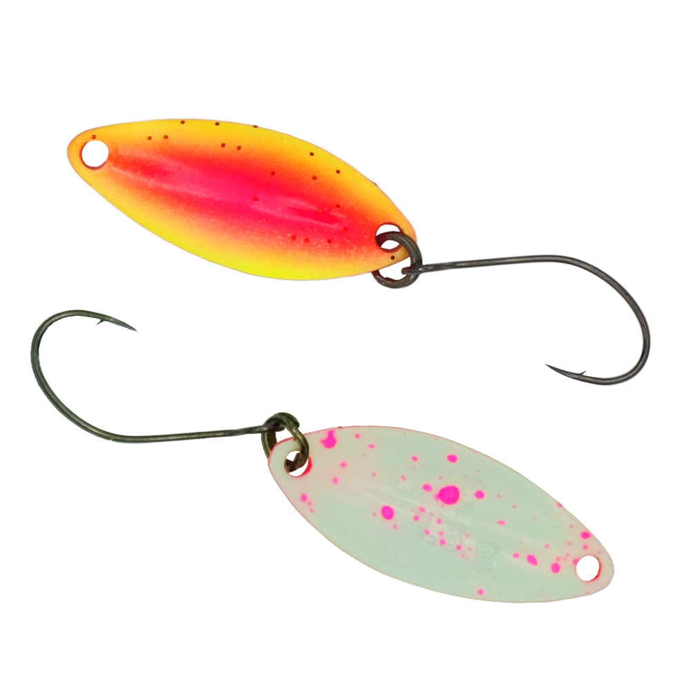 Antem MIC 1.3 g ist ein brandneuer Spoon von FANGENSWERT MIC ist der leichteste Spoon in der Serie und in erster Linie für extrem passive Forellen unter schwierigen Bedingungen, wie z.B. Mittagszeit, Hochsommer, stark beangelte Gewässer etc., konzipiert. MIC kann trotz seines relativ geringen Gewichts ziemlich weit ausgeworfen werden, was seiner aerodynamischen Form zu verdanken ist. Diese Form sorgt auch dafür, dass der Spoon selbst bei kleinsten Kurbelumdrehungen sein schönes Spiel entfaltet, sehr frequent läuft und die zickigen Fische provoziert.