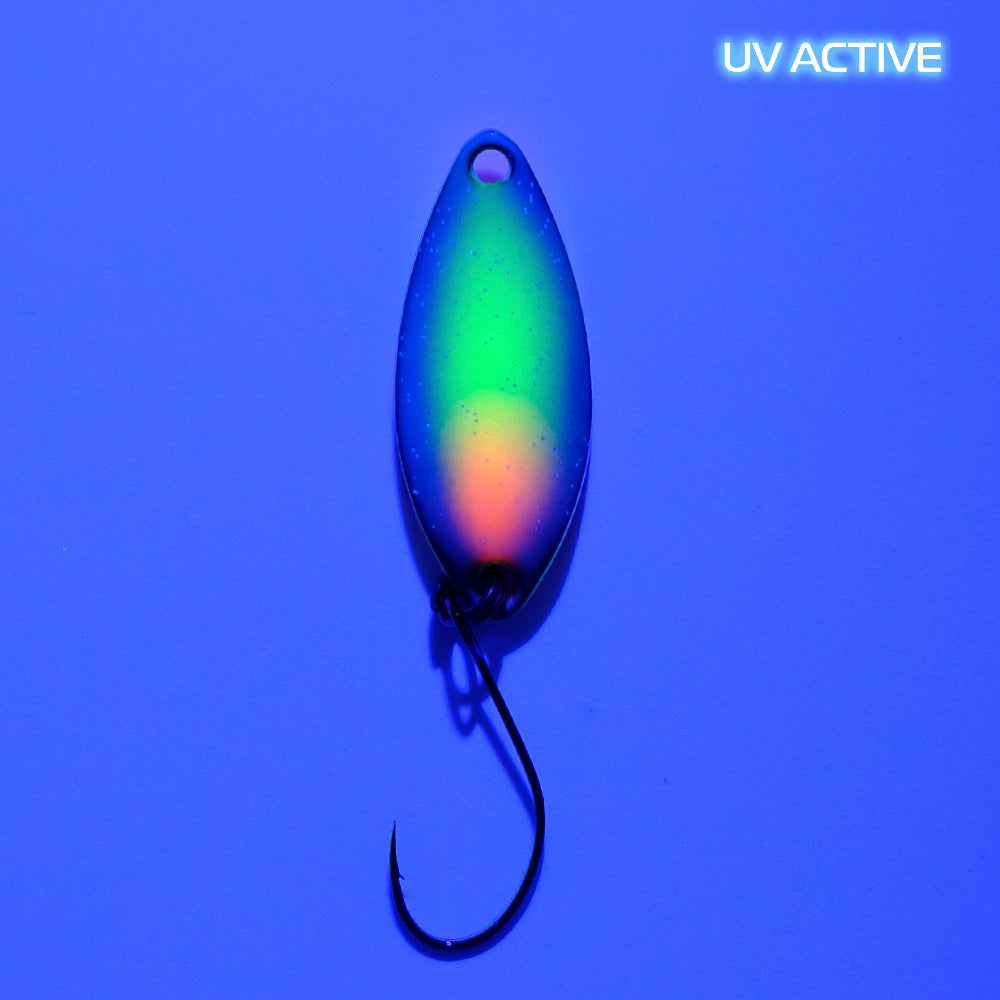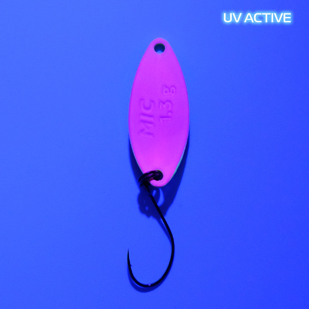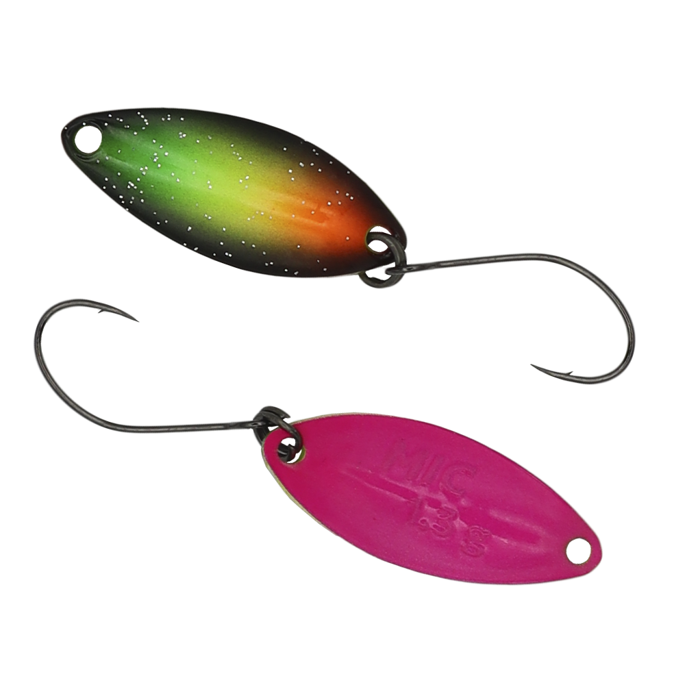 Antem MIC 1.3 g ist ein brandneuer Spoon von FANGENSWERT MIC ist der leichteste Spoon in der Serie und in erster Linie für extrem passive Forellen unter schwierigen Bedingungen, wie z.B. Mittagszeit, Hochsommer, stark beangelte Gewässer etc., konzipiert. MIC kann trotz seines relativ geringen Gewichts ziemlich weit ausgeworfen werden, was seiner aerodynamischen Form zu verdanken ist. Diese Form sorgt auch dafür, dass der Spoon selbst bei kleinsten Kurbelumdrehungen sein schönes Spiel entfaltet, sehr frequent läuft und die zickigen Fische provoziert.