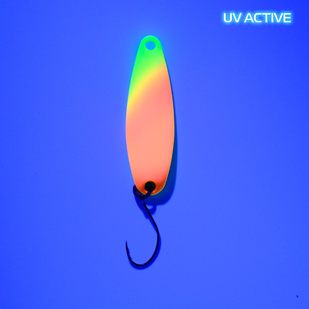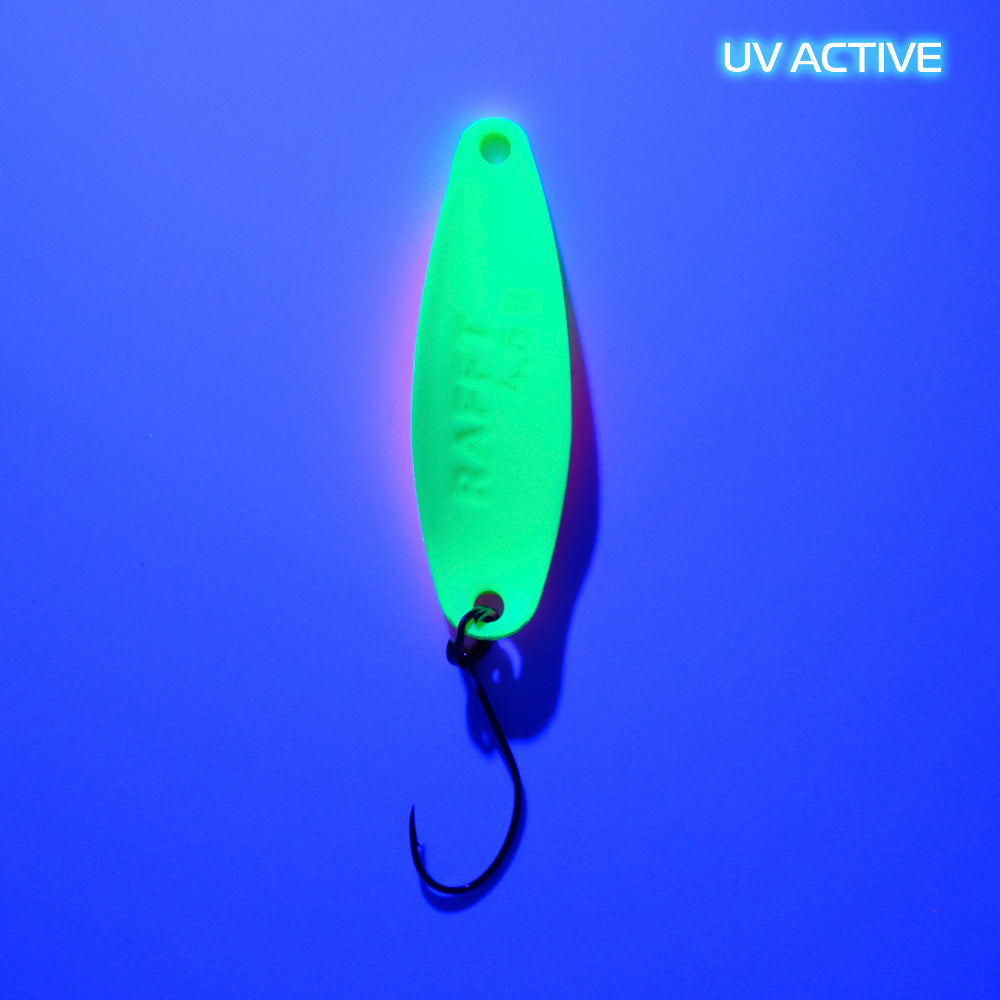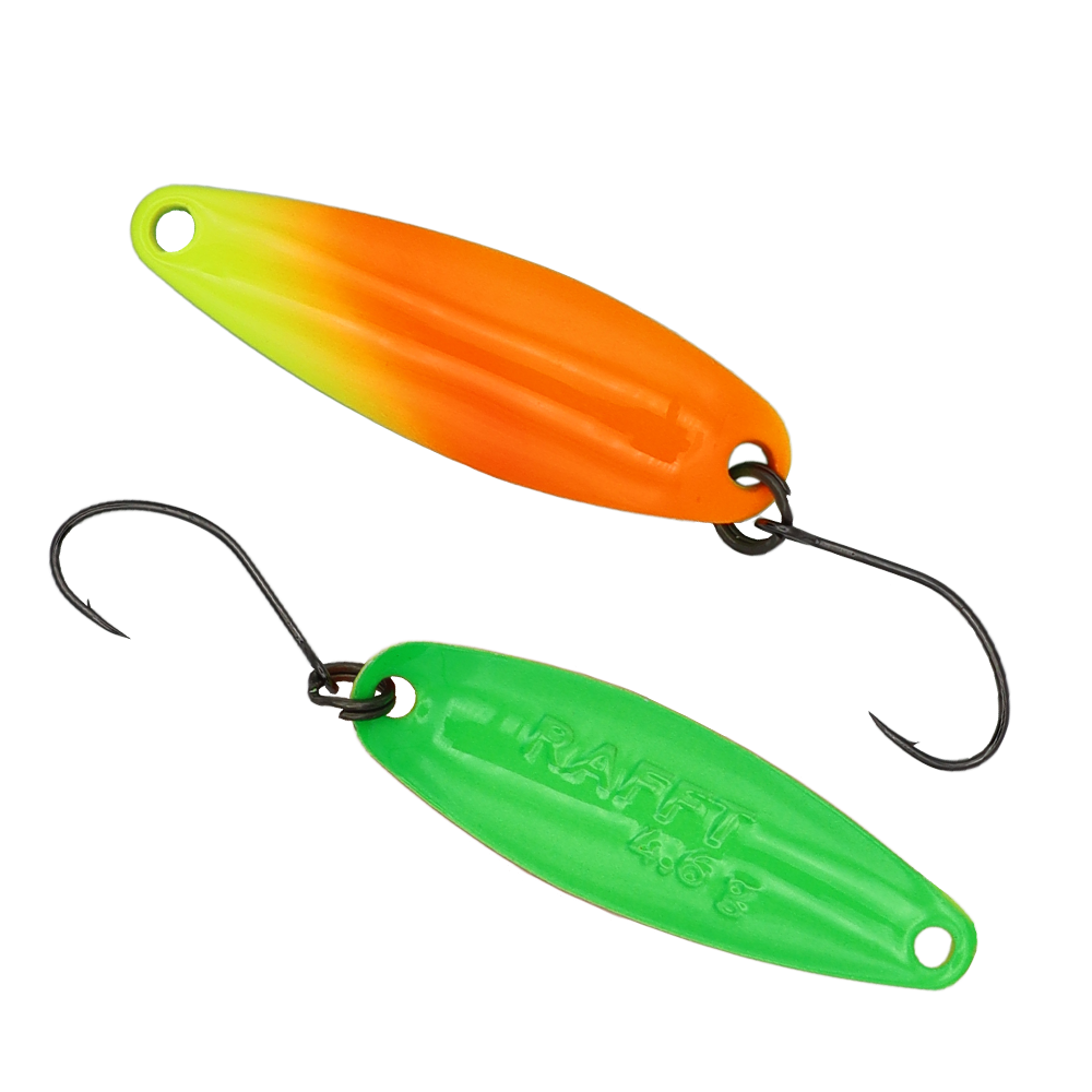 RAFFT 4.6 g ist ein brandneuer Spoon von FANGENSWERT, RAFFT ist der schwerste Spoon in der Serie und somit für weite Würfe und Angeln im Mittelwasser sowie grundnah konzipiert. Durch seinen frequenten Lauf lockt RAFFT die Forellen an und provoziert sie zum Biss. Sehr oft kommen die Attacken auch beim Absinken, denn in dieser Phase hat RAFFT 4.6 g ebenso ein schönes einzigartiges Spiel, das selbst die vorsichtigsten Salmoniden nicht kalt lässt.