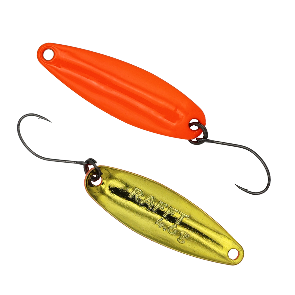 RAFFT 4.6 g ist ein brandneuer Spoon von FANGENSWERT, RAFFT ist der schwerste Spoon in der Serie und somit für weite Würfe und Angeln im Mittelwasser sowie grundnah konzipiert. Durch seinen frequenten Lauf lockt RAFFT die Forellen an und provoziert sie zum Biss. Sehr oft kommen die Attacken auch beim Absinken, denn in dieser Phase hat RAFFT 4.6 g ebenso ein schönes einzigartiges Spiel, das selbst die vorsichtigsten Salmoniden nicht kalt lässt.