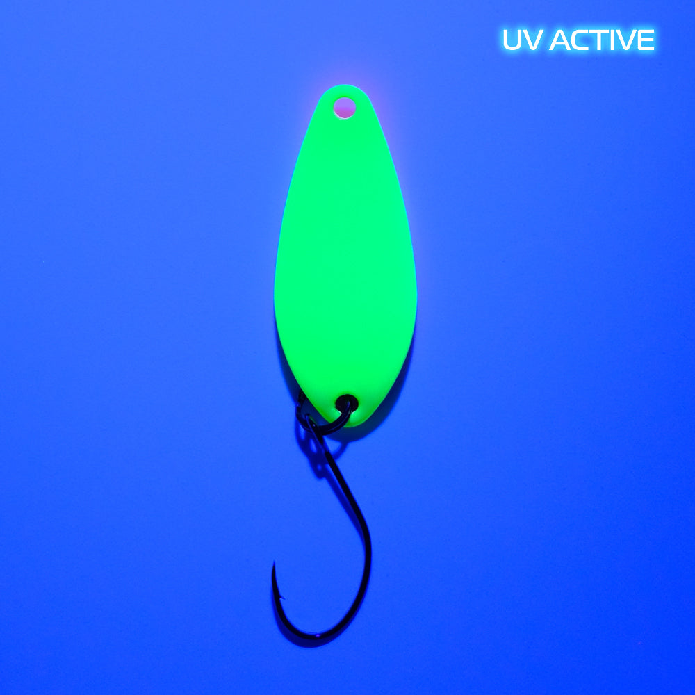 CHEAT 2 g ist ein brandneuer Spoon von FANGENSWERT. Wie der Name dieses äußerst interessanten Spoons schon verrät, wird CHEAT am Wasser sehr oft zu einem universellen Schlüssel, der praktisch alle Türen der Forellenwelt öffnen kann. Denn dieser Spoon kann wirklich alles. Mit seinem Gewicht von 2 g und seiner durchdachten Form lässt sich CHEAT richtig weit auswerfen und kann bei Bedarf in nahezu allen Wassertiefen geführt werden, auch wenn er in erster Linie fürs Mittelwasser konzipiert ist. Als ein ziemlich breitflächiger Spoon entfaltet CHEAT sein schönes Spiel direkt mit der ersten Kurbelumdrehung.