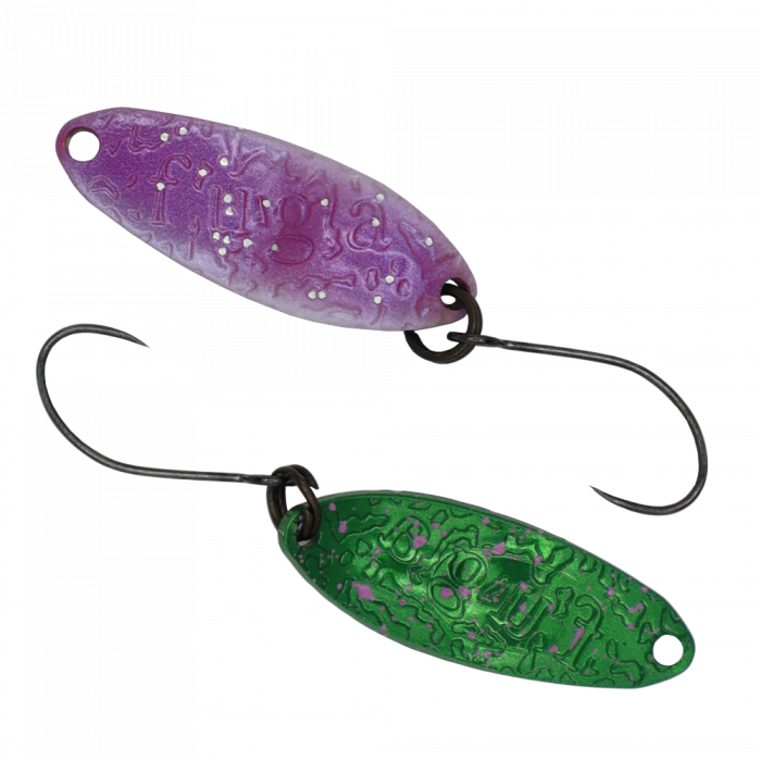 Fuga in 2.2 g ist der schwerere Bruder vom kleinen Fuga 0.8 g und bestens für weite Würfe geeignet. Mit diesem Spoon kann man sehr gut aktive und mittelpassive Fische erreichen, die meistens recht aggressiv auf ihn reagieren: Das zeichnet sich oft durch starke, gut erkennbare Bisse, was jedem Angler eine ganze Menge Spaß bereitet. Aber auch passive Fische können des Öfteren diesem „frechen“ Spoon nicht widerstehen. Beide Brüder ergänzen sich ideal und sorgen für konstante Erfolge am Wasser.