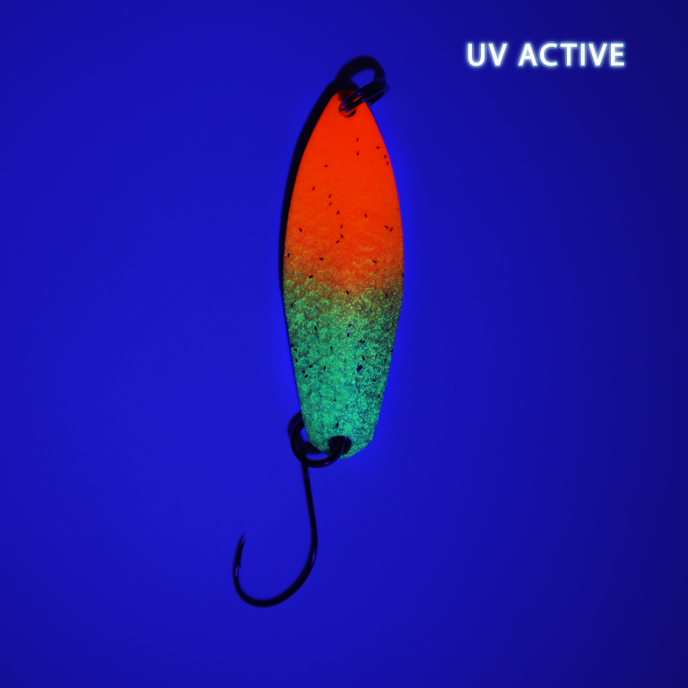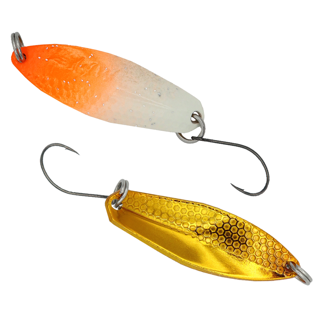 GAiA ab 4.8 g bis 7,7g von GOD HANDS ist ein Spoon, der durch seine Form jeden begeistern kann. Lang gezogen und breitflächig zugleich, mit einem mittigen „Bruch“, der allmählich mit einer Y-förmigen Biegung endet. Die eine Hälfte des Spoons hat dabei mehrere sechseckige Schnitte, die bei der Führung für einen einmaligen flimmernden Effekt sorgen. In der Kombination mit seinem sehr frequenten Lauf lässt GAiA selbst die zickigsten Forellen nicht kalt.