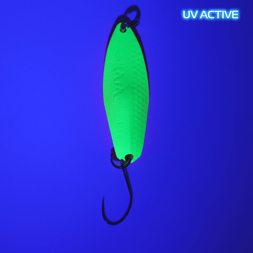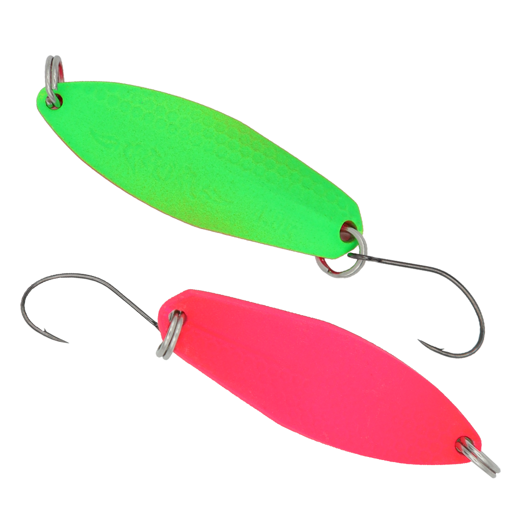 GAiA ab 4.8 g bis 7,7g von GOD HANDS ist ein Spoon, der durch seine Form jeden begeistern kann. Lang gezogen und breitflächig zugleich, mit einem mittigen „Bruch“, der allmählich mit einer Y-förmigen Biegung endet. Die eine Hälfte des Spoons hat dabei mehrere sechseckige Schnitte, die bei der Führung für einen einmaligen flimmernden Effekt sorgen. In der Kombination mit seinem sehr frequenten Lauf lässt GAiA selbst die zickigsten Forellen nicht kalt.