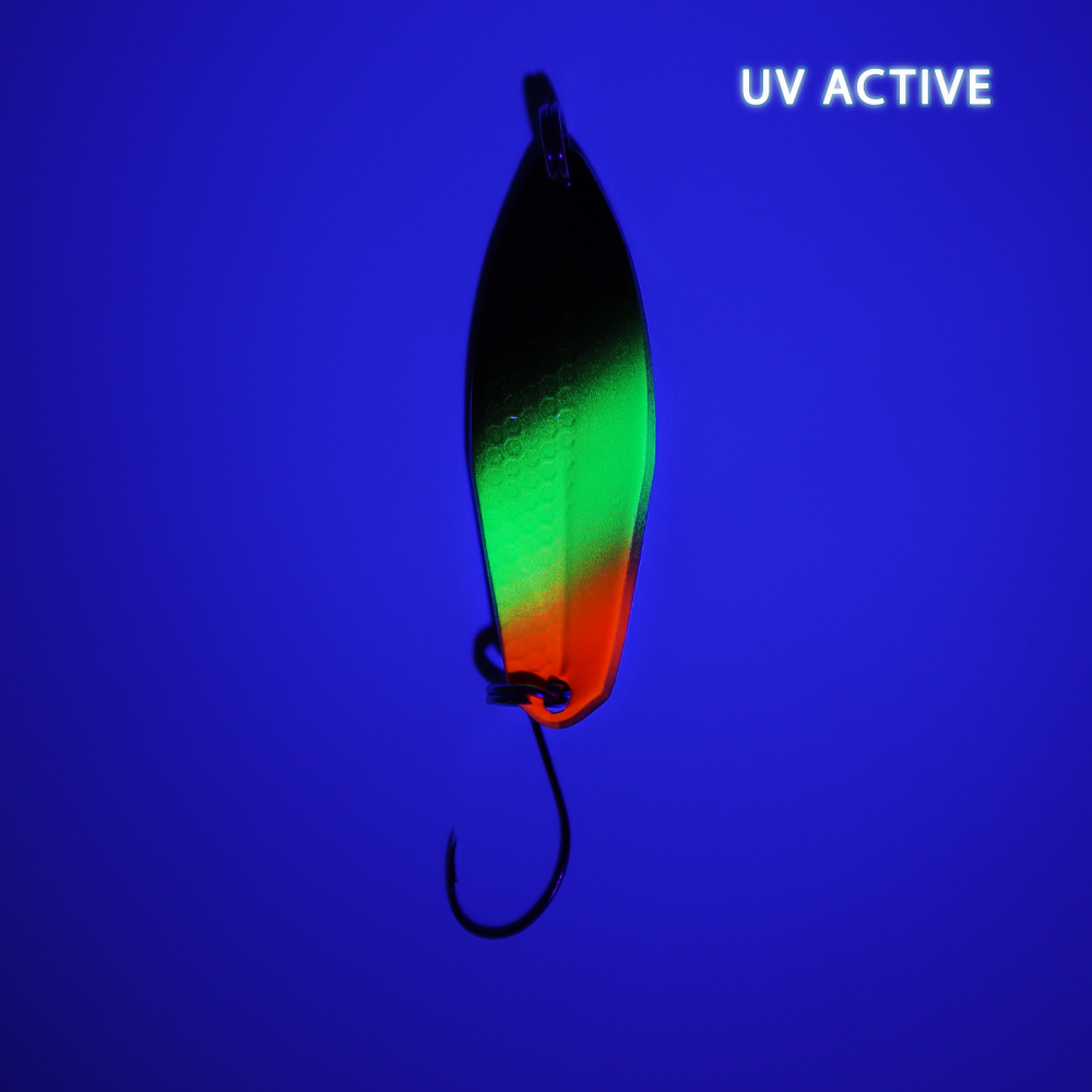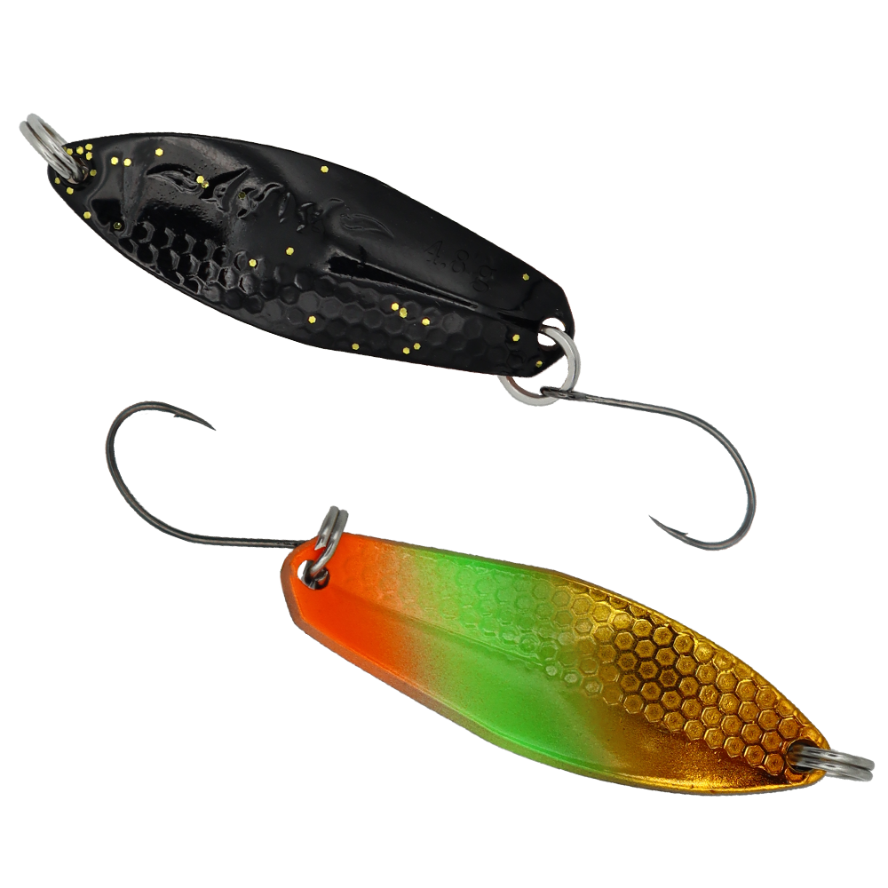 GAiA ab 4.8 g bis 7,7g von GOD HANDS ist ein Spoon, der durch seine Form jeden begeistern kann. Lang gezogen und breitflächig zugleich, mit einem mittigen „Bruch“, der allmählich mit einer Y-förmigen Biegung endet. Die eine Hälfte des Spoons hat dabei mehrere sechseckige Schnitte, die bei der Führung für einen einmaligen flimmernden Effekt sorgen. In der Kombination mit seinem sehr frequenten Lauf lässt GAiA selbst die zickigsten Forellen nicht kalt.