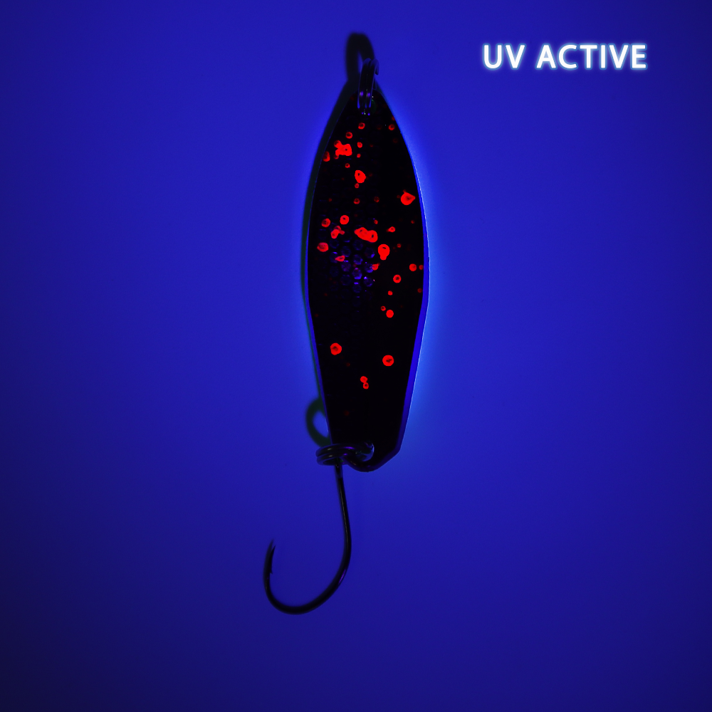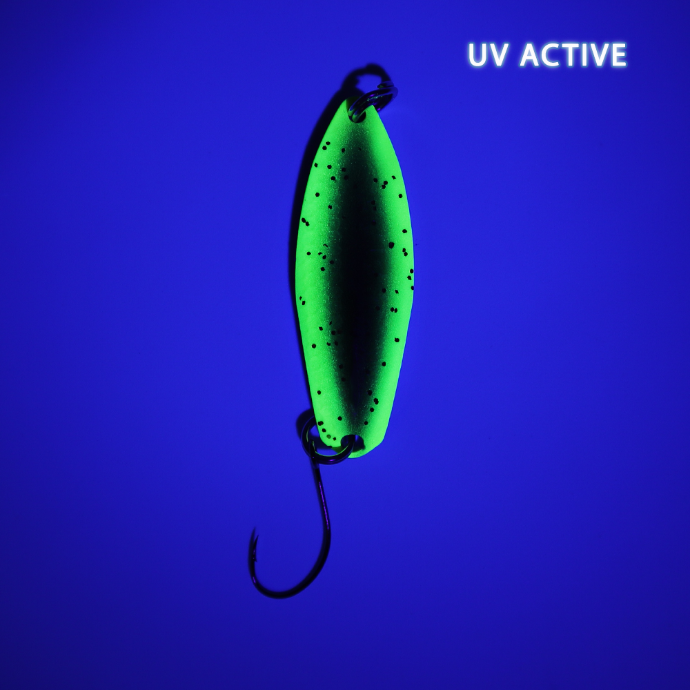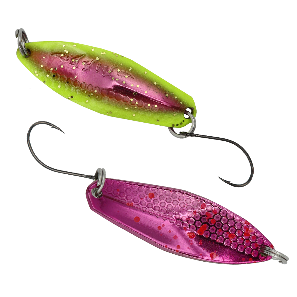 GAiA ab 4.8 g bis 7,7g von GOD HANDS ist ein Spoon, der durch seine Form jeden begeistern kann. Lang gezogen und breitflächig zugleich, mit einem mittigen „Bruch“, der allmählich mit einer Y-förmigen Biegung endet. Die eine Hälfte des Spoons hat dabei mehrere sechseckige Schnitte, die bei der Führung für einen einmaligen flimmernden Effekt sorgen. In der Kombination mit seinem sehr frequenten Lauf lässt GAiA selbst die zickigsten Forellen nicht kalt.