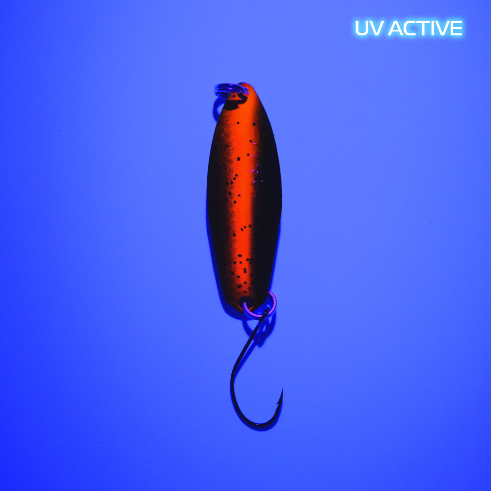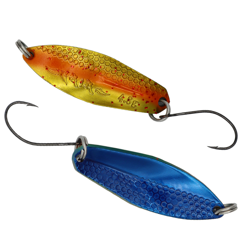 GAiA ab 4.8 g bis 7,7g von GOD HANDS ist ein Spoon, der durch seine Form jeden begeistern kann. Lang gezogen und breitflächig zugleich, mit einem mittigen „Bruch“, der allmählich mit einer Y-förmigen Biegung endet. Die eine Hälfte des Spoons hat dabei mehrere sechseckige Schnitte, die bei der Führung für einen einmaligen flimmernden Effekt sorgen. In der Kombination mit seinem sehr frequenten Lauf lässt GAiA selbst die zickigsten Forellen nicht kalt.