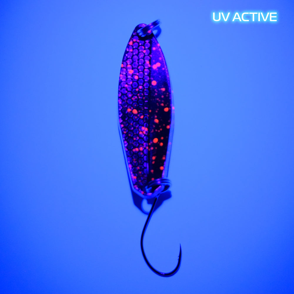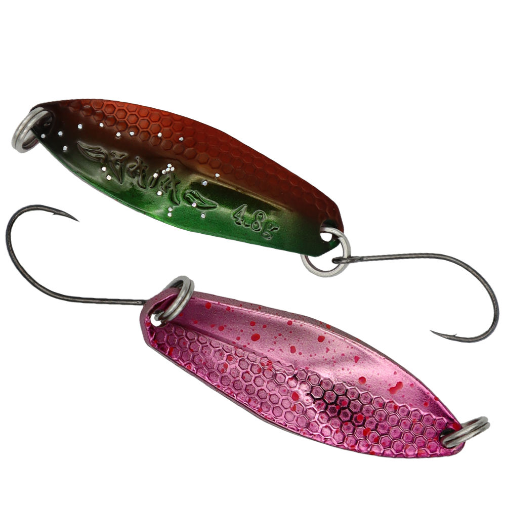 GAiA ab 4.8 g bis 7,7g von GOD HANDS ist ein Spoon, der durch seine Form jeden begeistern kann. Lang gezogen und breitflächig zugleich, mit einem mittigen „Bruch“, der allmählich mit einer Y-förmigen Biegung endet. Die eine Hälfte des Spoons hat dabei mehrere sechseckige Schnitte, die bei der Führung für einen einmaligen flimmernden Effekt sorgen. In der Kombination mit seinem sehr frequenten Lauf lässt GAiA selbst die zickigsten Forellen nicht kalt.