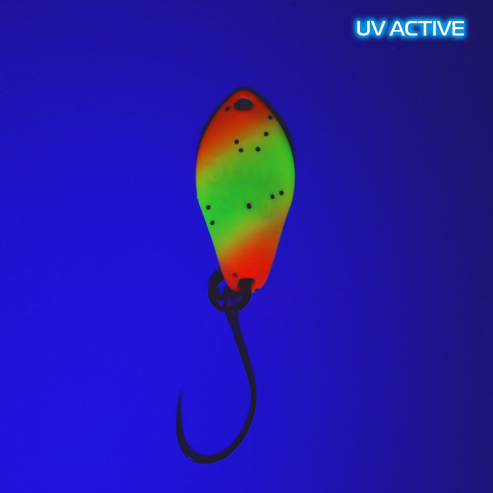 Jriya ist der Klassiker unter den hoch frequenten Spoons. Selbst bei kleinsten Kurbelumdrehungen hat Jriya ein sehr schönes Spiel, das einem ins Wasser gefallenen Insekt verblüffend ähnlich ist. Das provoziert insbesondere passive Fische, die still und kaltblütig im Wasser auf Opfer lauern. Jriya kann dank seiner Form ziemlich weit ausgeworfen werden. Durch das geringe Gewicht arbeitet Jriya ideal beim Absinken. Genau in diesem Moment kommen sehr oft viele Bisse.